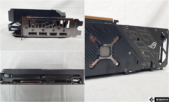 내부에는 2.9 슬롯 사이즈의 큰 히트싱크가 제공되는 모습이고, STRIX 쿨러 상단 디자인 특유의 RGB LED 효과도 주목되는 부분이다. 후면에는 스틸 백플레이트가 제공되며, 듀얼 바이오스를 설정할 수 있는 부분도 눈에 띈다.