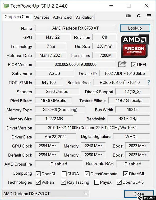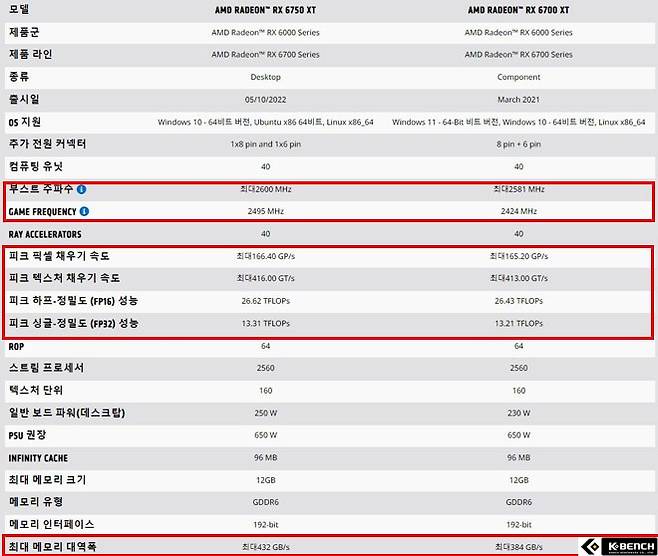 스펙적인 부분을 살펴보자면, 레퍼런스 기준으로 따졌을 경우 기존에 RX 6700XT 에서 베이스 클럭은 조금 낮춘 상태지만, 게임 클럭과 부스트 클럭, 그리고 메모리 클럭을 향상시키며, 게임 퍼포먼스 측면에 있어서 더나은 모습을 볼 수 있도록 디자인한 제품이 이번 RX 6750XT 제품이라고 볼 수 있다.