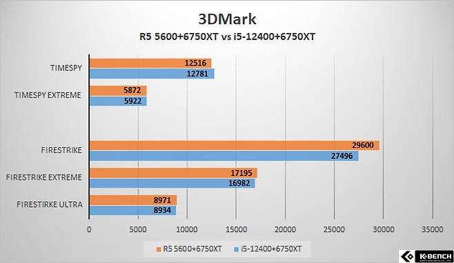 반면 본격적인 그래픽 성능 기반의 벤치마크 툴인 3DMark에서는 두 시스템간에 드라마틱한 차이가 있는 건 아니지만, 결과를 보면 확실히 토탈 점수 차이가 있는걸 볼 수 있다. DX11 기반의 테스트에서 R5 5600 CPU 활용한 시스템이 좀더 앞서는 모습, DX12 기반에서는 i5-12400 CPU 시스템이 조금 높게 나온 모습이다.