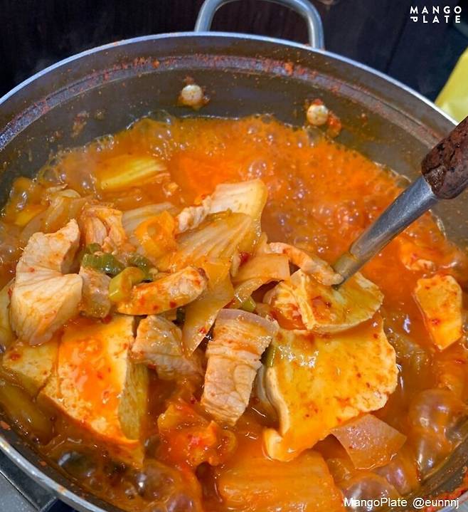 신선하고 향긋한 다양한 쌈채소와 함께 나오는 김치찌개는 큼직한 고기가 아주 가득 차 있는 것이 특징인데요. 두부의 은은한 고소함은 물론 돼지고기의 진득한 고소함이 합쳐져 아주 매력적인 맛을 자랑하죠. 김치의 시원 칼칼하면서도 톡 쏘는 맛까지 더해져 한국인의 입맛을 제대로 저격한 메뉴라 할 수 있습니다.