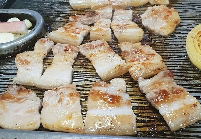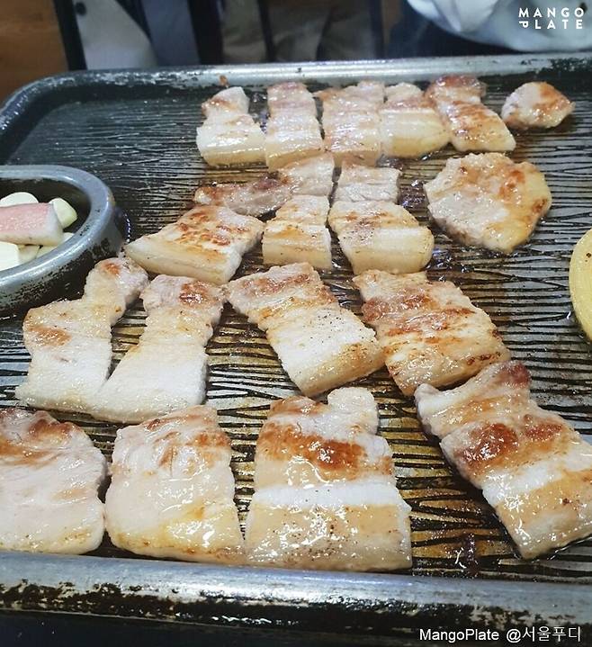 삼겹살은 잡내가 전혀 나지 않고 구수한 풍미가 살아있어 시원한 쌈 채소, 그리고 은은하면서도 깊은 맛을 지닌 된장과 찰떡궁합이죠. 삼겹살은 너무 두껍지도 얇지도 않은 적절한 두께에 쫀득한 비계와 야들야들한 살코기의 조합이 정석적이라 할 수 있습니다. 고기 폭탄 김치찌개에 구워 먹는 삼겹살이라니, 육식러들에게는 무조건이죠!