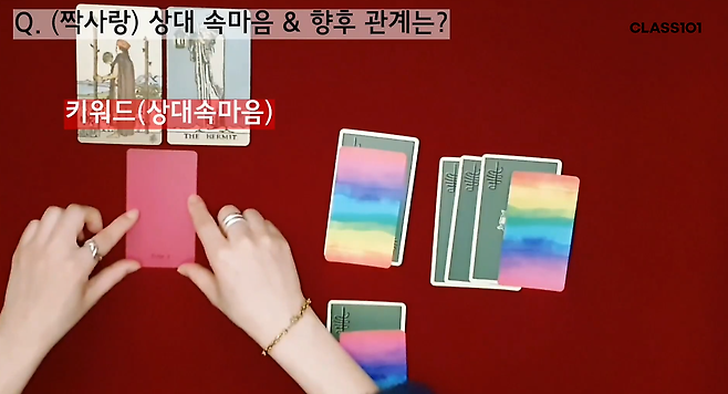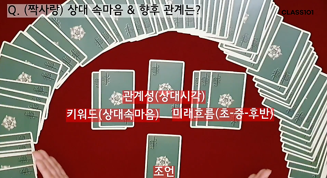 마지막으로 1장의 카드는 아래쪽에 놓아요. 이 카드는 '조언' 카드입니다. 이제 카드 리딩을 시작해 보겠습니다.