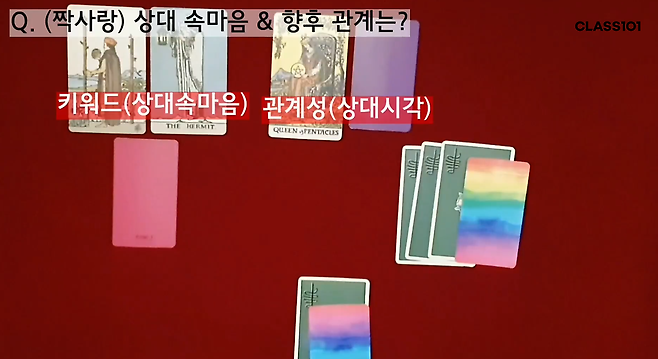 재회운은 상대방의 마음을 알지 못하는 경우의 대표적인 사례라고 볼 수 있어요. 우선 펼쳐진 카드 중 상대의 속마음에 해당하는 '키워드' 카드 2장을 좌측에 두고, 상대의 시각을 알아보는 '관계성' 카드 1장을 중앙에, 초-중-후반 관계의 흐름을 알아보는 '미래흐름' 카드 3장을 우측에 놓습니다.