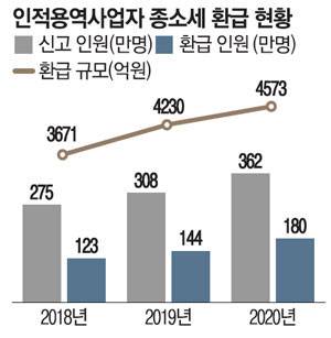 종소세 환급을 받은 인적용역 사업자는 2018년 123만명에서 2019년 144만명, 2020년 180만명으로 2년 만에 약 46% 증가했다. 환급세액 지급 규모도 2018년 3671억원에서 2019년에는 4230억원으로 늘었고, 2020년에는 4573억원으로 1년 만에 300억원가량 불어났다.
