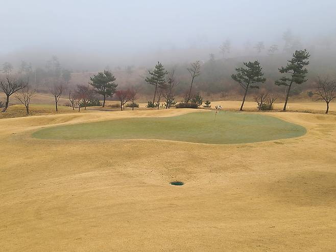 그린 표면은 모래가 얇게 뿌려있었고 관리도 겨울 동안 잘 관리된 걸로 보입니다. 피치 마크도 수리가 잘 된 편이며, 공이 기대 이상으로 튀거나 크게 벗어나지 않아서 퍼팅하기에 불만은 없었습니다.