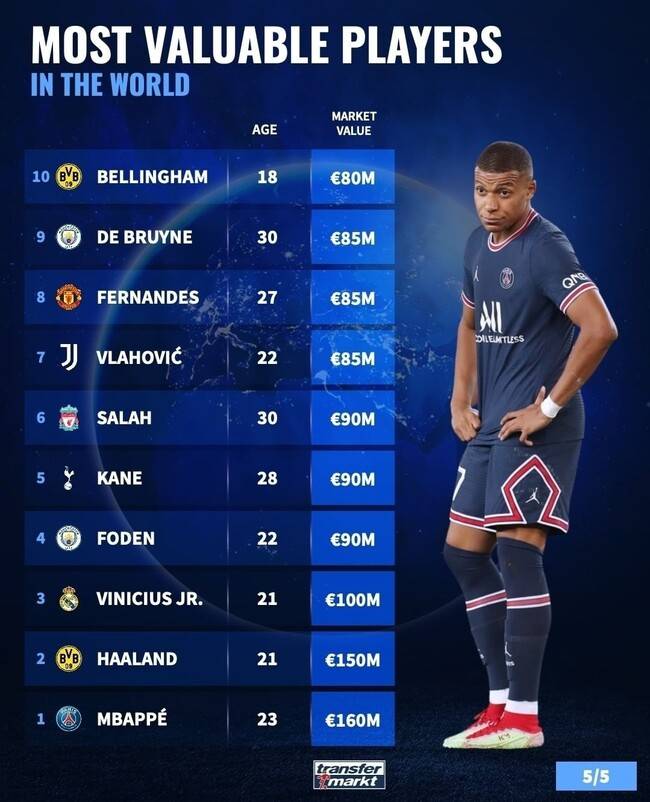 세계 최고의 몸값의 주인공은 킬리안 음바페(파리 생제르맹)였다. 음바페는 얼마 전 소속팀과 새로운 계약을 체결했다. 엄청난 연봉과 팀을 지휘할 수 있는 권한이 주어진 만큼 영향력이 큰 선수다. 매체는 음바페에게 1억 6,000만 유로(약 2,176억 원)을 매겼다.