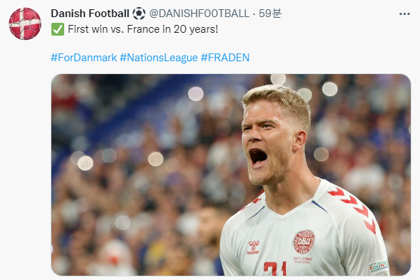4일(한국시간) 프랑스 파리의 스타드 드 프랑스에서 2022-2023 유럽축구연맹(UEFA) 네이션스리그 A조 1차전을 가진 덴마크가 프랑스에 2-1로 승리했다. 이로써 덴마크가 A조에서 2위에 올랐고 프랑스는 3위에 위치했다.