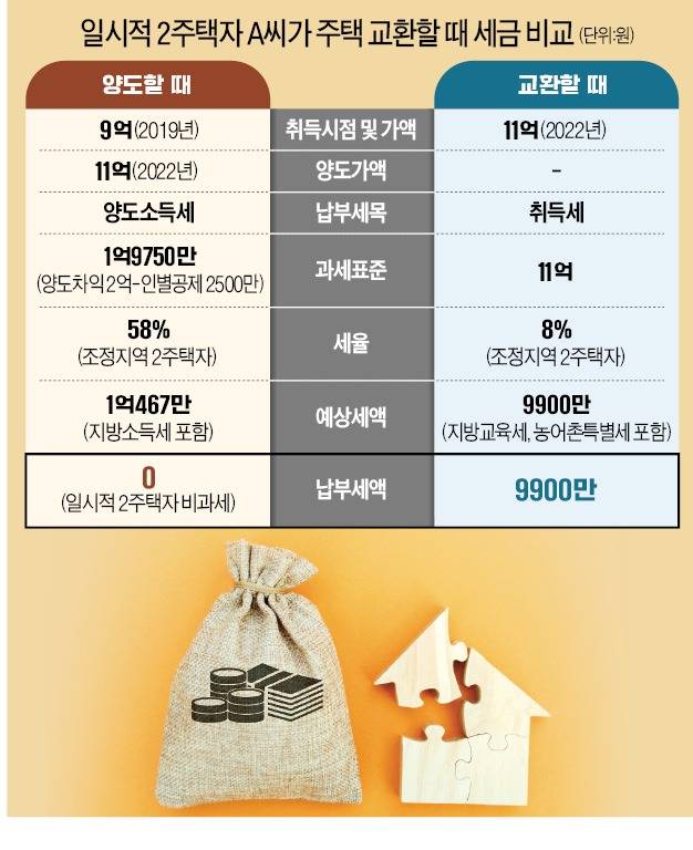 A씨가 주택을 물물교환하면 기존 집을 팔고 새로운 집을 매수한 셈이 된다. A씨의 주택 매도 희망 가격이 11억원인 만큼 같은 가치의 아파트를 주고받으면 주택 취득가액도 11억원으로 인정받는다. 나중에 교환을 통해 취득한 주택의 가격이 오르더라도 높아진 취득가액 덕에 양도차익이 적어져 추후 주택을 팔 때 내는 양도세도 줄일 수 있다.