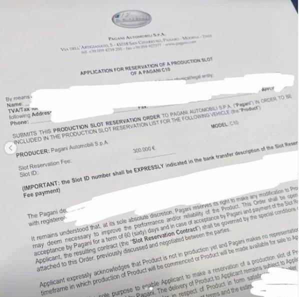 문서는 ‘파가니 C10 생산 슬롯 예약 신청’이라는 제목으로 파가니 브랜드 실을 함께 보여준다. 내용을 보면 예약 금액은 30만 유로(약 33만 달러)로 파가니 하이퍼카 한정 모델 금액에 적합한 수준이다.