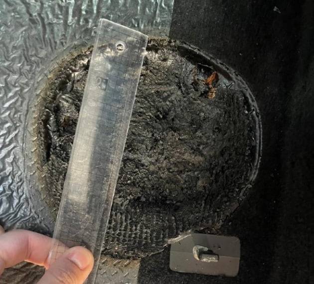 동그란 흔적의 지름은 15cm를 넘는 크기였다. 번개탄이라 불리는 착화탄 규격이 지름 13.1cm에 두께가 5cm인 점을 감안하면 주변까지 녹은 착화탄 흔적이 15cm가량이라는 예상이 가능하다.