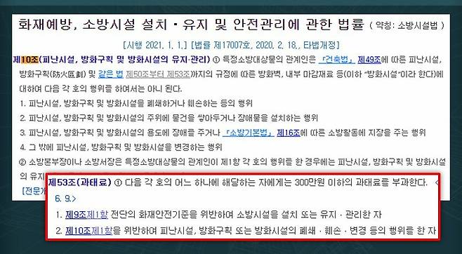 한 전문가는 이에 대해 “피난시설 방화구획이나 방화시설 주변에 장애물을 설치하거나 물건을 쌓아두는 행위는 소방법상으로 금지되어 있다”며 “위반시 300만 원 이하의 과태료를 물 수 있다”는 말을 전했다. 누리꾼들은 “소방법 위반. 과연 업체가 몰랐을까?”. “건축법 위반사항이다. 해체 전까지 강제이행금 부과해야하는 형사처벌대상임”이라는 반응을 보였다.