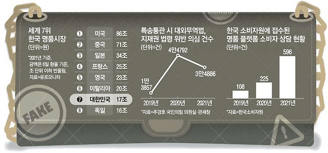 국내에서 정·가품 이슈는 계속 이어질 전망이다. 추경호 국민의힘 의원이 관세청으로부터 제출받은 자료에 따르면 지난해 인천공항 특송 통관 과정에서 원산지 표기와 지식재산권 법령 위반 의심 건수는 3만4886건에 달했다. 2016년 7508건에서 5년 만에 다섯 배나 늘었다. 국내 명품시장 규모는 지난해 17조원으로 추산한다. 세계 7위에 해당하는 규모다.