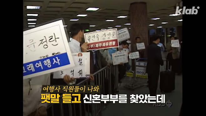 여행사 직원들이 팻말을 들고 신혼부부를 찾았다고 합니다.