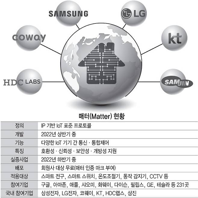 13일 관련 업계에 따르면 최근 KT와 HDC 자회사인 HDC랩스, 사물인터넷(IoT) 솔루션 업체 삼진은 글로벌 홈 IoT 통신표준 규격 '매터(Matter)' 개발 협의체에 가입했다. 삼성전자와 LG전자, 코웨이에 이어 매터 얼라이언스에 가입한 우리나라 기업은 여섯 개로 늘었다.
