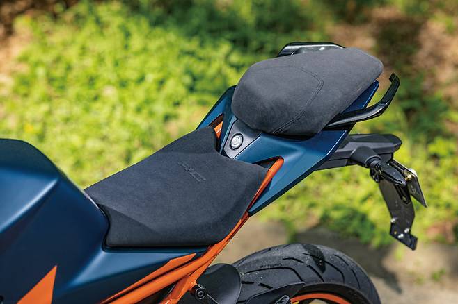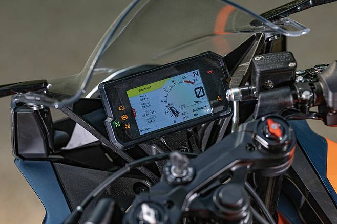시트는 마찰력이 우수한 재질로 변경되었고 RC 로고를 더해 디테일을 높인다. 시트고는 824mm이며 차체 폭이 좁다 보니 수치보다 발착지성이 좋다. 신장 178cm의 라이더가 자연스레 자세를 잡아보면 핸들은 예상보다 멀게 느껴지며 전체적으로 넉넉하고 편안한 느낌이다. 구형 모델과 달리 탑브리지 디자인이 변경되어 이제 제대로 된 클립 온 핸들 바가 장착되었고 라이더의 체형에 따라 높이 조절을 할 수 있다. 그다음으로 눈에 띄는 건 TFT 디스플레이다.