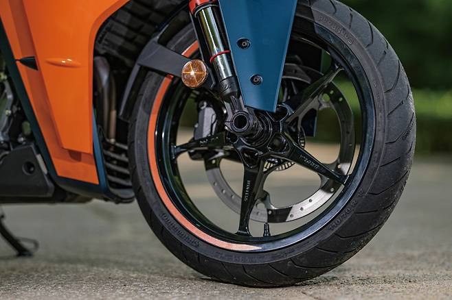 새로운 RC 390은 강렬한 첫인상만큼 완전히 다른 차량이다. 간단히 변경된 내용을 짚어주자면 먼저 격자 형태의 프레임은 이전 모델 대비 1.5kg을 경량화 했고 강성을 더해 고속 주행 안정성을 높였다. 또한 메인 프레임과 서브 프레임을 일체형에서 볼트 온 방식으로 변경해 정비성을 높였다. 여기에 WP 43mm APEX 프런트 포크와 APEX 리어 쇽이 장착되었다. 포크는 좌우 압축과 신장을 별개로 담당하며 각각 30클릭으로 세밀한 댐핑 조절이 가능하다. 액슬 클램프 역시 경량화 된 새로운 부품이다. 리어 쇽은 기존과 동일하게 프리로드와 리바운드 댐핑을 조절할 수 있다. 디자인부터 확 달라진 휠은 오픈 허브 방식으로 이전 모델 대비 3.4kg을 감량하여 현가하질량을 낮춘다.