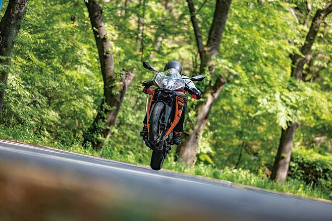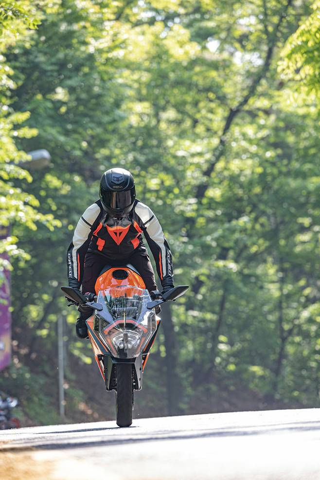 누군가 새로운 RC 390을 부드럽다, 쉽다, 안전하다는 키워드만으로 해석한다면 순정 세팅 그대로 아무것도 건드리지 않았을 것이고, 그건 RC 390의 절반도 맛을 보지 못한 것과 같다. KTM은 ‘레디 투 레이스’ 즉, 레이스에 출전하기 위해 준비한다는 슬로건을 바이크의 특성에 녹여놨다. MTC를 해제하고 슈퍼모토 ABS모드로 설정하고 달리면 신세계가 열린다. 가속감은 크게 달라지지 않지만 낮은 속도에서 스로틀을 비틀면 프런트 휠이 들썩인다. 배기량의 한계에 따라 엄청난 출력이 쏟아지는 건 아니지만 한층 더 가볍고 빠르게 달린다. 서스펜션은 전후 모두 부드러운 세팅인데 프런트포크 상단의 다이얼을 시계 방향으로 조여주면 확실한 댐핑 차이를 느낄 수 있다.