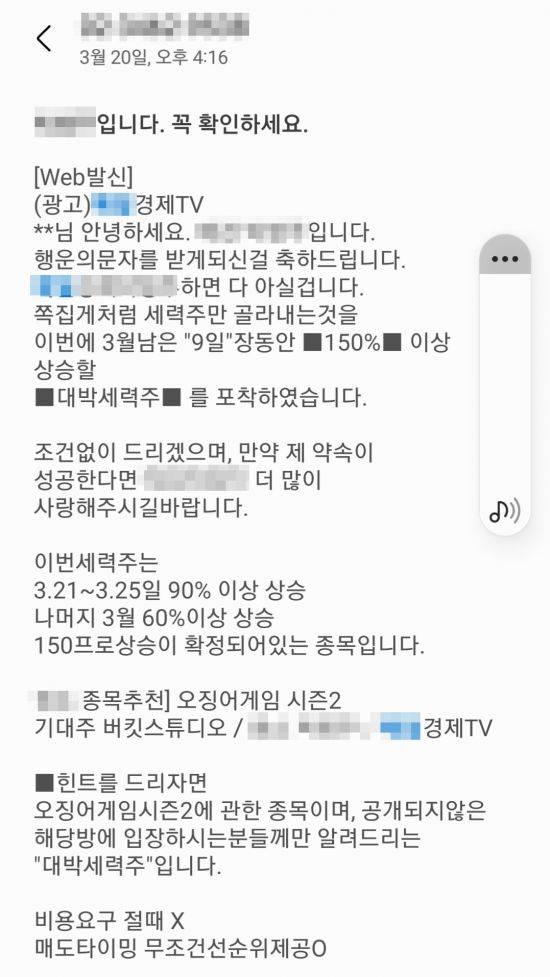 [아시아경제 오규민 기자] 주식투자에 빠져있는 전모씨(54)는 얼마 전 솔깃한 문자 한 통을 받았다. ‘OO경제 A입니다. 족집게처럼 세력주만 골라내 9일 동안 150%이상 올려드립니다’라는 투자 권유 내용이었다. 코로나19로 사업이 어려워진 상황에서 문자에 눈길에 갈 수 밖에 없었다. 전씨는 혹시나하는 마음에 남편과 주위 사람들에게 문자를 보여주었더니 역시나였다. 대부분 비슷한 문자를 받고 ‘사기’를 당한 이들도 있었다.