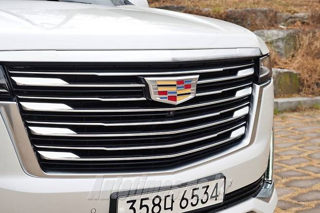 크기를 부각시키는 디자인도 한 몫 한다. 모든 공기를 흡입할 것처럼 보이는 그릴은 범퍼 끝단까지 수직으로 떨어진다. 강력한 존재감을 나타내며 손바닥 한 뼘을 전부 사용해도 부족한 캐딜락 로고가 멋을 더한다. LED 헤드램프는 기존 세로에서 가로 형태로 과감하게 바꿔 한층 안정적이며 명확한 인상을 완성했다. 반면 주간주행등과 방향지시등은 세로로 길게 내려와 패밀리-룩을 맞췄다. 특히 앞범퍼 양 끝 쪽에 위치해 차가 더 넓어 보이는 효과를 줬다. 불을 밝히는 과정도 화려한데 유리 표면을 보는 것처럼 고급스럽게 마감돼 있다.