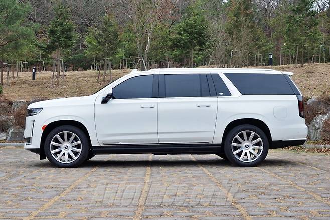 에스컬레이드 ESV는 5세대 에스컬레이드의 차체를 늘린 롱 휠베이스 제품이다. 한 눈에 봐도 압도적인 크기가 시선을 사로잡는다. 실제 ESV는 신형 에스컬레이드(5,380㎜) 대비 385㎜ 길어진 5,765㎜의 길이다. 앞뒤 바퀴 사이 거리를 뜻하는 휠베이스는 신형(3,071㎜) 대비 336㎜ 늘려 3.4m를 훌쩍 넘긴다. 국내 시판 SUV 중 가장 길며 웬만한 플래그십 세단도 명함을 내밀지 못할 정도의 길이다.