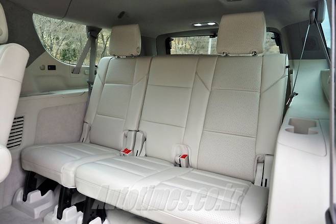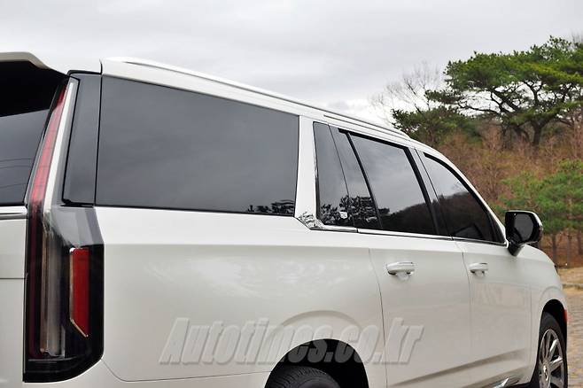 얇게 무드등을 넣은 문 손잡이, B필러 부근에 양각으로 새긴 캐딜락 로고, 금속 장식은 자칫 밋밋할 수 있는 외관에 신선한 포인트로 다가온다. 또 3열까지 뻗은 넓은 면전의 유리창은 ESV를 표현하는 킬링 포인트로 손색이 없다.