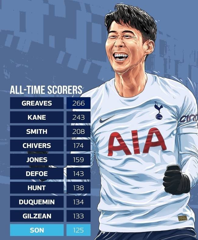 토트넘은 손흥민이 10일 열린 빌라전 해트트릭을 기록하면서 총 125골을 달성해 10위에 위치한 소식을 축하했다.