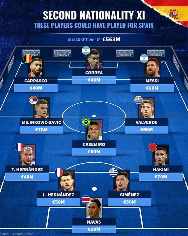 유럽 축구 통계 매체 ‘트랜스퍼마크트’는 6일(한국시간) 스페인 이중국적자를 중심으로 베스트 11을 꾸려봤다.