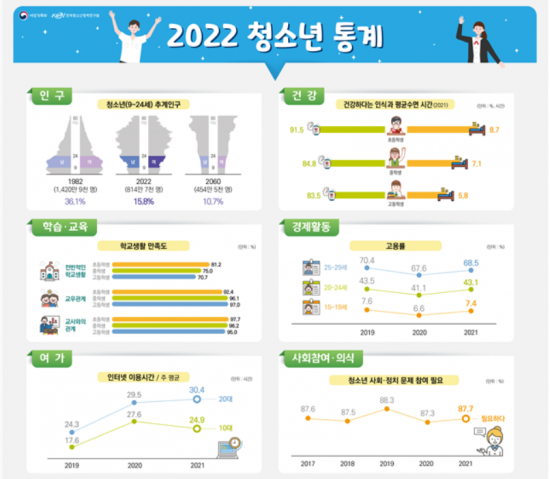 청소년(9~24세) 인구는 2022년 기준 814만7000명으로 전체 인구의 15.8%에서 2060년에는 454만명(10.7%)까지 감소할 것으로 전망된다. 학령인구(6~21세)는 2022년 기준 748만2000명(14.5%)에서 2060년에는 총 인구의 416만7000명(9.8%)으로 줄어들 전망이다.