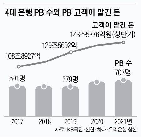 100조원이 넘는 PB(Private Banker·프라이빗 뱅커) 시장을 잡으려는 은행·증권사들의 경쟁이 가열되고 있다. 인터넷전문은행이나 AI(인공지능) 주식투자앱 등 핀테크 기업의 성장으로 고객 기반을 위협받는 은행·증권사들이 자신들의 강점인 ‘자산 관리’로 우량 고객 붙잡기에 나선 것이다. KB국민·신한·하나·우리 등 4대 은행의 경우 PB 고객이 맡긴 돈이 최근 5년 새 32% 늘면서 작년 6월 143조원을 넘어섰다.