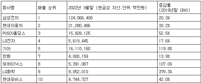 [표] 매출 20대 기업 현금성 자산 현황(CEO스코어 제공)