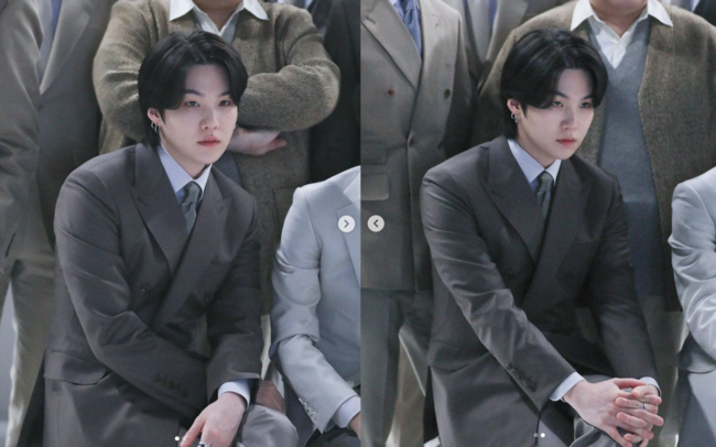 31일, 슈가는 자신의 SNS에 “(대충 수트 이모티콘)"이라는 글과 함께 두 장의 사진을 게재했다. 공개된 사진 속 그는 다크 그레이의 수트를 입고 카리스마를 뽐내는 모습. 특히 그가 올린 두 장의 사진이 상반된 분위기라 더 눈길을 끈다.