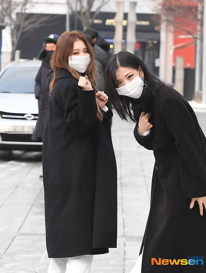 걸그룹 프로미스나인 이채영, 이나경(왼쪽)이 1월 19일 오후 SBS 파워FM '박소현의 러브게임' 녹음 일정 차 서울 양천구 SBS 목동 사옥으로 들어서고 있다.