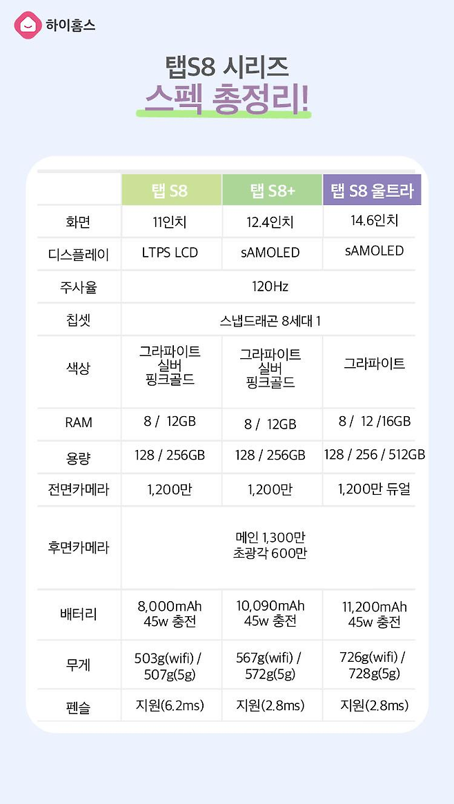 마지막으로 갤럭시 탭 S8 시리즈 스펙표 정리하고 마무리 하겠습니다.