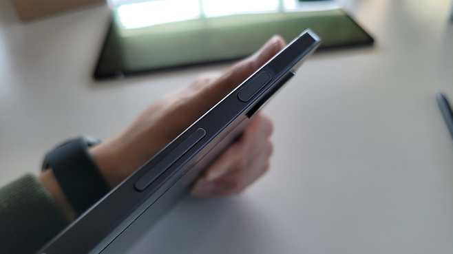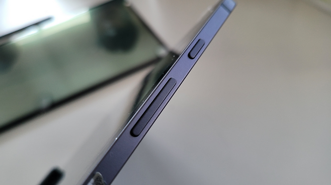 갤럭시 탭 S8 상단에는 지문인식 센서가 내장된 전원과 볼륨 버튼, 마이크로 SD와 USIM 슬롯이 있습니다.