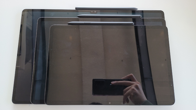 작은것부터 갤럭시 탭 S8, S8+, S8 울트라 모델입니다.