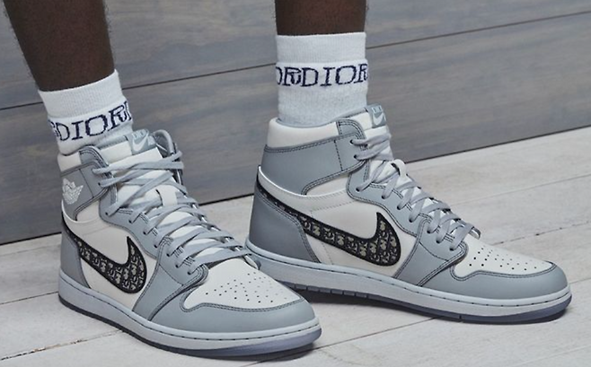 나이키는 이번 루이비통뿐 아니라 디올과도 협업을 진행했었습니다. 2020년 디올과 손잡고 에어조던1을 출시했죠. 에어조던1 스우시에 디올 대표 패턴이 가득 새겨져 있습니다. 회색과 흰색이 적절하게 조화를 이루고 있습니다. 신발 밑창은 반투명 하늘색으로 오른쪽 밑창엔 ‘DIOR’, 왼쪽 밑창엔 에어조던의 대표 로고가 그려져 있습니다. 이 신발은 사람들 사이에서 ‘에어 디올’, ‘디올맛 조던’이라고 불립니다.