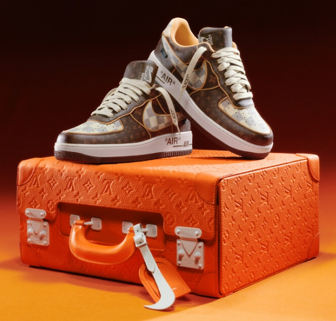 2022년 1월 26일부터 2월 8일까지 진행된 소더비 경매에 나왔던 에어포스1은 프랑스 명품 브랜드 ‘루이비통(Louis Vuitton)’과 협업한 제품입니다. 나이키는 에어포스1을 출시한 지 40년째 되는 2022년 발매를 계획으로 루이비통과 손을 잡았습니다. 이번 협업 제품의 메인 색상은 루이비통을 상징하는 다크 브라운(dark brown)이고, 루이비통을 상징하는 모노그램 패턴이 신발 전체를 감싸고 있습니다. 이탈리아 피에소 다르티코에 있는 루이비통 신발 공방에서 제작했습니다.