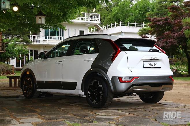 측면에서는 차량 전체 색상과 다른 컬러가 적용된 C필러가 눈길을 끄는 요소. 이 C필러와 도어 하단 가니시의 컬러를 맞춰 차량이 좀 더 콤팩트해 보이는 느낌을 준다. 먼저 선보인 니로 하이브리드와 마찬가지로 C필러 안쪽으로는 통풍구를 마련해 원활한 공기 흐름으로 전비 향상에 도움을 준다. 전기차답게 휠은 공기 저항을 줄이는 전용 휠이 장착됐다.