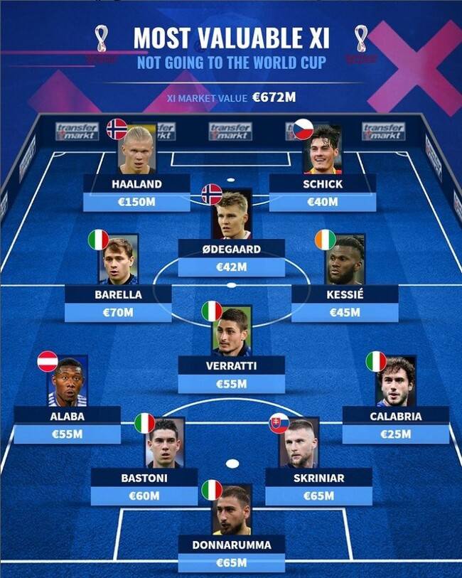 이런 상황에서 유럽 이적 시장 전문 매체 ‘트랜스퍼 마크트’는 2022 카타르 월드컵에 나서지 못하는 선수들로 베스트11을 꾸렸다. 몸값 기준이다.