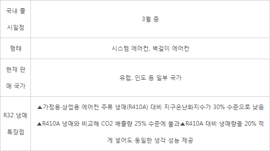 LG전자는 2018년부터 유럽, 인도 등 해외에 판매하는 시스템 에어컨에 R32 냉매를 적용했다. 국내에서는 R32 냉매가 약가연성 물질로 분류돼 KC안전기준에 맞지 않는다는 이유로 출시되지 못했다. 지난해 8월 국제기준(IEC 60335-2-40)에 맞춰 전기용품 안전기준(KC 60335-2-40)이 개정되면서 R32 적용 에어컨 국내 출시가 가능해졌다.