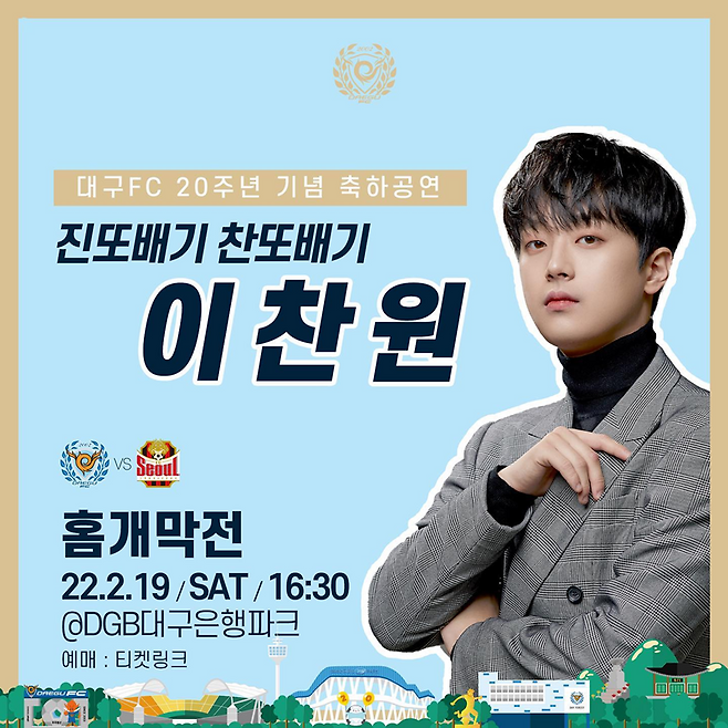 창단 20주년 기념 홈 개막전에 화려함을 더해줄 주인공은 대구 출신 트로트 가수 이찬원이다. 드레스 코드 하늘색을 맞춰 입고 대팍을 찾을 이찬원은 하프타임 그라운드에서 대구의 승리를 응원한 뒤 축하 공연까지 펼치게 된다. 축하 공연의 경우 경기 중계에는 잡히지 않아 경기장에서만 공연을 함께 즐길 수 있다.
