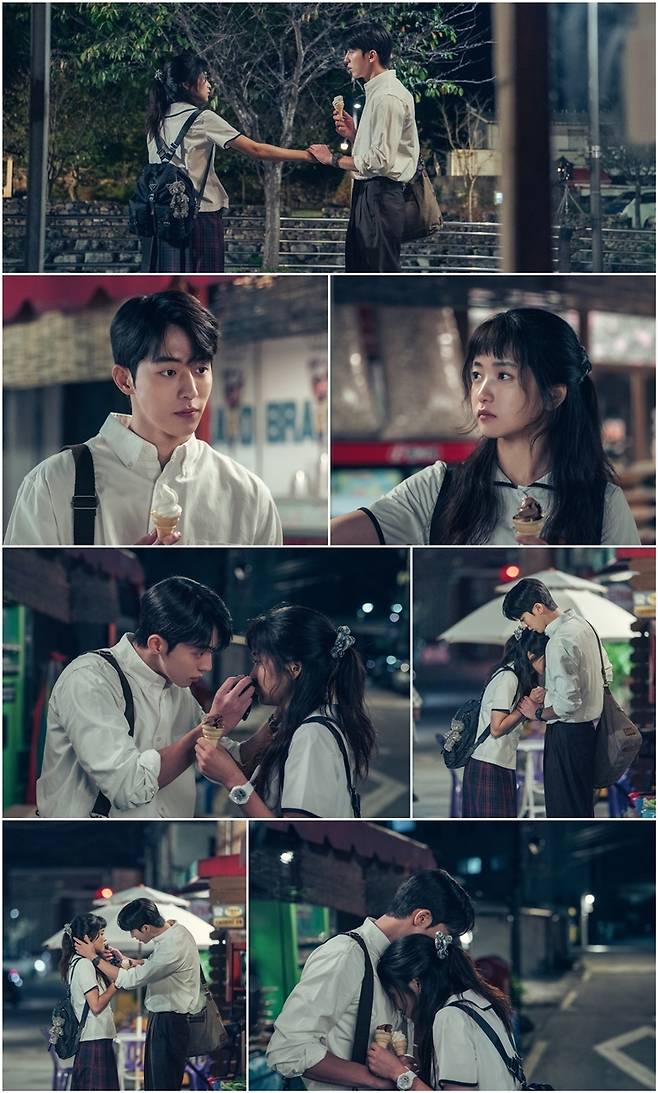 나희도는 초콜릿 아이스크림을, 백이진은 바닐라 아이스크림을 손에 든 채 서로를 바라보고 있는 장면. 티격태격하며 대화를 나누던 두 사람의 곁으로 오토바이가 빠른 속도로 지나가자 깜짝 놀란 백이진은 나희도를 자신의 품으로 확 끌어당긴다. 결국 나희도 얼굴에 아이스크림이 묻게 되고, 백이진이 이를 다정한 손길로 닦아주는 것. 운명처럼 다시 만난 두 사람 사이에 이상 기류가 포착되며 호기심이 증폭되고 있다.