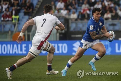 epa09753340 England's Tom Curry (L) and Italy?s Marco Zanon in action during the Six Nations rugby union tournament match between Italy and England at the Stadio Olimpico in Rome, Italy, 13 February 2022. EPA/FABIO FRUSTACI