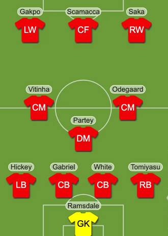 HITC는 아스날이 원하는 선수 영입에 모두 성공할 경우 스카마카가 최전방 공격수로 나서고 코디 각포와 사카가 측면 공격을 이끌 것으로 점쳤다. 또한 비티냐가 외데가르드, 파르티와 함께 중원을 구축할 것으로 점쳤다. 수비진은 기존의 마갈량이스, 화이트, 토미야스와 함께 히키가 포백을 구성할 것으로 예상했다. 주축 골키퍼는 변함없이 램스데일이 맡을 것으로 점쳤다. 아스날이 전력 보강에 성공할 경우 마르티넬리와 쟈카 등은 포지션 경쟁에서 밀릴 것으로 예상됐다.