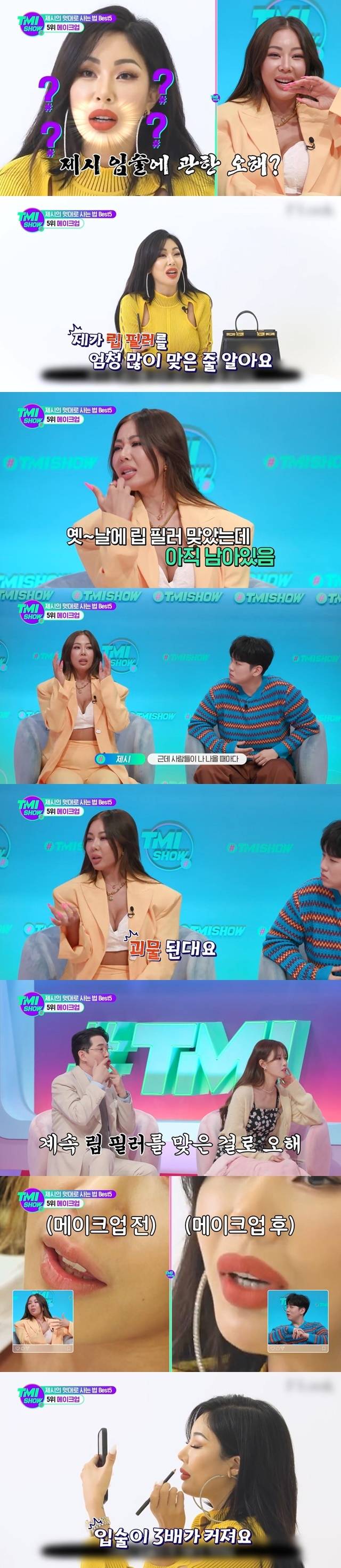 제시는 립 라이너로 오버라인 입술을 그린다며 "입술이 3배로 커진다. 눈 감고도 할 수 있다"고 말했다.