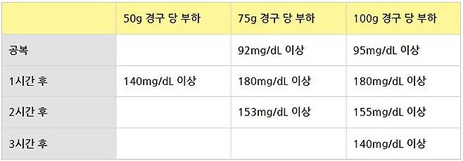 100g 경구 당 부하 검사에서 비정상적인 혈당 수치가 4번 중 2번 이상 확인되고, 75g 경구 당 부하 검사에서는 3번 중 1번 이상 확인되면, 임신성 당뇨병으로 진단한다.