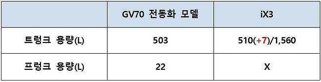 트렁크 공간은 iX3가 더 넓다. 기본 용량은 510L, 2열 시트를 모두 접으면 최대 1,560L까지 늘어난다. GV70의 트렁크 용량은 503L로, 내연기관 모델보다 39L 줄었다. 대신 iX3에 없는 22L 용량의 ‘프렁크(앞 트렁크)’를 마련했다.