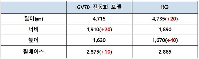 다음은 덩치 비교. 두 차의 길이는 4.7m를 조금 넘기는데, iX3가 20㎜ 더 길다. 반면 너비는 GV70가 약 1.9m로 좀 더 넉넉하다. 키는 iX3가 1,670㎜로 약 40㎜ 크다. 휠베이스는 GV70와 iX3 모두 약 2.9m인데, GV70가 약간 더 앞선다. 1㎝ 차이지만, 2열 다리 공간은 iX3보다 조금 더 넉넉할 전망이다.