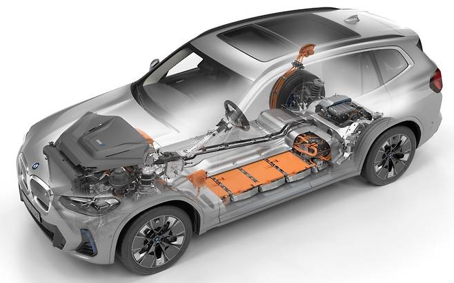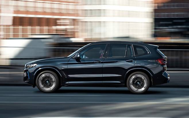iX3는 BMW 5세대 ‘e드라이브(eDrive)’ 전기 구동계를 밑바탕 삼았다. 뒤 차축에 전기 모터를 심어 최고출력 286마력, 최대토크 40.8㎏·m를 낸다. 정지 상태에서 시속 100㎞ 가속 시간은 6.8초. 최고속도는 시속 180㎞다. X3보다 무게중심을 74㎜ 낮추고, 앞뒤 무게를 43:57로 나눠 BMW 뒷바퀴 굴림 모델 특유의 날렵한 핸들링까지 챙겼다.