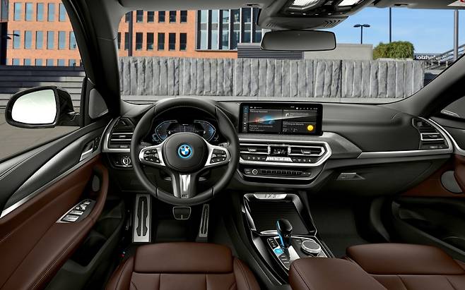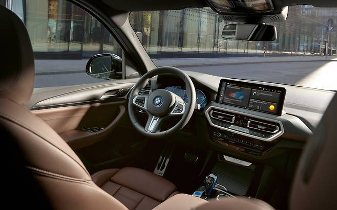 iX3의 실내는 ‘운전자 중심’적이다. 왼쪽으로 기운 센터페시아와 두툼한 3-스포크 스티어링 휠이 대표적이다. 대시보드에는 12.3인치 디지털 계기판과 12.3인치 인포테인먼트 디스플레이를 넣었다. 운전대 중심 BMW 로고 테두리와 기어노브, 전원 스위치(시동 버튼)는 하늘색으로 마감해 X3와 차별화했다.